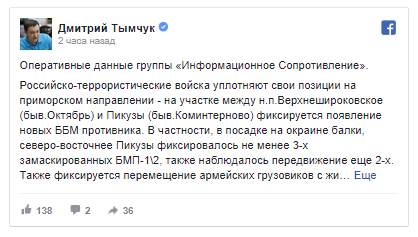Об этом на своей странице в Facebook написал руководитель группы "Информационное сопротивление", народный депутат Дмитрий Тымчук.
