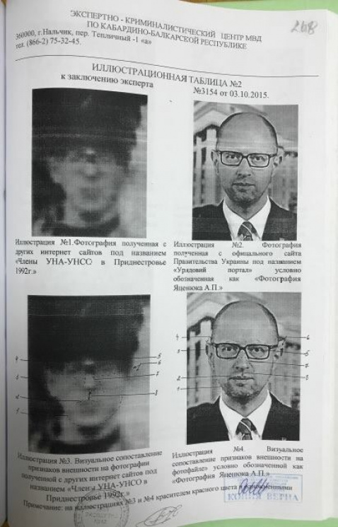 Напомним, что 13 сентября пресс-секретарь Яценюка выложила в фейсбуке выдержки из материалов «чеченского» дела против Яценюка. Судя по ним, российские следователи сравнивали фотографию Яценюка и человека в камуфляже и с оружием в руках, сделанную предположительно в Приднестровье. Криминалисты пришли к выводу, что на них, «вероятно, изображено одно и то же лицо».
