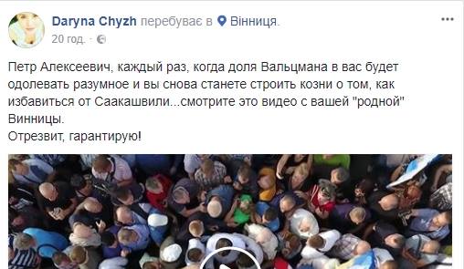 Ранее Дарина Чиж написала пост, в котором назвала Порошенко "Вальцманом" (таким образом враги президента обычно намекают на его якобы еврейские корни). "Каждый раз, когда доля Вальцмана будет одолевать в вас разумное и вы снова станете строить козни о том, как избавиться от Саакашвили..."