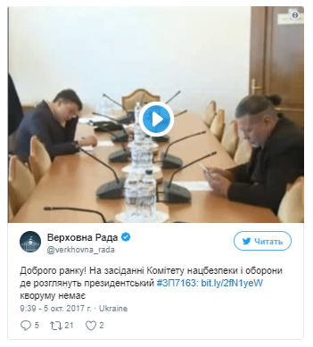 "Доброе утро! На заседании Комитета по национальной безопасности и обороне, где должны рассмотреть президентские законопроекты по Донбассу, кворума нет", – говорится в сообщении Комитета.
