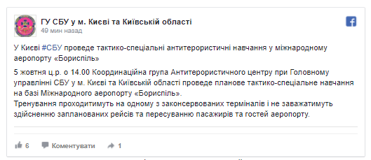 "5 октября в 14:00 Координационная группа Антитеррористического центра при Главном управлении СБУ в Киеве и Киевской области проведет плановое тактико-специальное учение на базе международного аэропорта "Борисполь", - сообщили в СБУ.