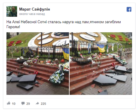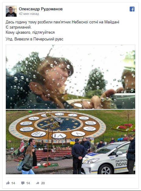 "Человек, который это сделал, сейчас в патрульной машине. Сообщил, что Небесная сотня виновата в войне на Донбассе", - пишет журналист.