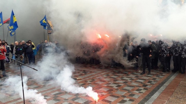 Под Радой проходит акция протеста активистов Свободы и Национального корпуса. Митингующие подожгли дымовые шашки и шины, передает РБК-Украина.
