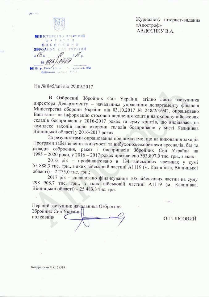 Что касается воинской части А1119 в городе Калиновка Винницкой области, где 26 сентября произошло ЧП, то, согласно информации, в 2016 году для охраны военных складов в Калиновке было выделено 2,275 млн грн.