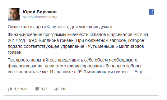 По словам Бирюкова, изначально на 2017 год на склады в Калиновке планировалось выделить 6,4 млн грн. Но после взрывов под Балаклеей финансирование было увеличено. При этом, для части А1119 финансирование реально начали открывать с 25 августа.