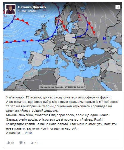 Об этом в Facebook сообщила синоптик Наталья Диденко.