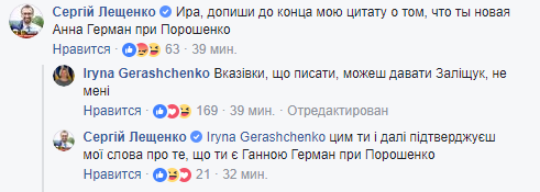 Сам же Лещенко после того, как Геращенко написала, что устала от его постоянной агрессии, непарламентской лексики и нетерпимости, а также неоднократных требований внести правки в публикации, заявил: