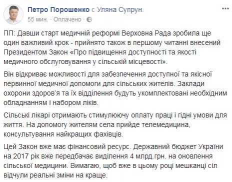 "Дав старт медицинской реформе, Верховная Рада сделала еще один важный шаг – принят также в первом чтении внесенный президентом закон "О повышении доступности и качества медицинского обслуживания в сельской местности". Он открывает возможности для обеспечения доступной и качественной первичной медицинской помощью сельских жителей. Учреждения здравоохранения и их отделения будут укомплектованы необходимым оборудованием и набором лекарств", – написал Порошенко.