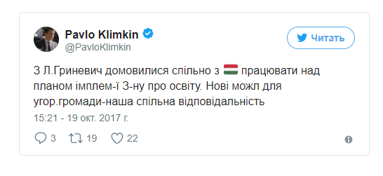 В то же время о договоренностях по языкам образования между Украиной и Венгрией написал и министр иностранных дел Павел Климкин на своей странице в соцсети Twitter.