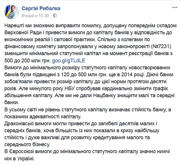 По этому поводу председатель финкомитета ВРУ Сергей Рыбалка сделал сообщение на странице Facebook, в котором отметил, что якобы он с коллегами "предложил снизить минимальный уставной капитал для новых банков с 200 до 500 тысяч грн".