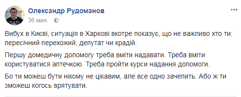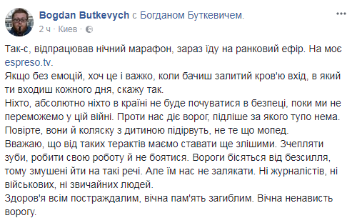 "Если без эмоций, хоть это и сложно, когда видишь залитый кровью вход, в который ты заходишь каждый день, скажу так: никто, абсолютно никто в стране не будет чувствовать себя в безопасности, пока мы не победим в этой войне. Против нас действует враг, подлее которого просто нет. Поверьте, они и коляску с ребенком взорвут, не то что мопед", – написал он.