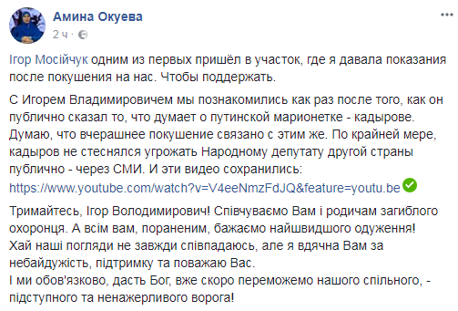 "Игорь Мосийчук одним из первых пришел в участок, где я давала показания после покушения на нас. Чтобы поддержать. С Игорем Владимировичем мы познакомились как раз после того, как он публично сказал то, что думает о путинской марионетке – кадырове. Думаю, что вчерашнее покушение связано с этим же. По крайней мере, кадыров не стеснялся угрожать народному депутату другой страны публично – через СМИ", – напомнила она.