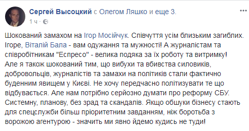 Выразил свое мнение по поводу покушения также депутат от "Народного Фронта" Сергей Высоцкий: "Шокирован покушением на Игоря Мосийчука. Соболезнования всем близким погибших. Виталий Бала – вам выздоровления и мужества! ... А нам нужно серьезно думать о реформе СБУ. Системной, плановой, без зрад и скандалов".