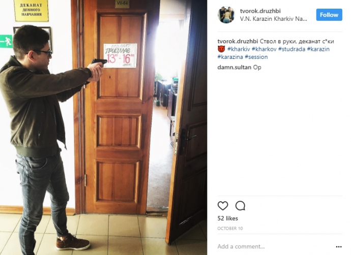 Этот молодой человек не первый раз выкладывает фото, видеоматериалы, на которых он запечатлен с оружием. Например, 10 октября он опубликовал фотографию с пистолетом под одним из деканатов Харьковского национального университета им. Каразина.