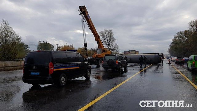Под Киевом на Одесской трассе произошло ДТП. В районе Глевахи водитель грузовика ЗИЛ, по предварительной информации, разворачивался в зоне ремонтных работ и ударил фуру с аммиаком, которая опрокинулась.