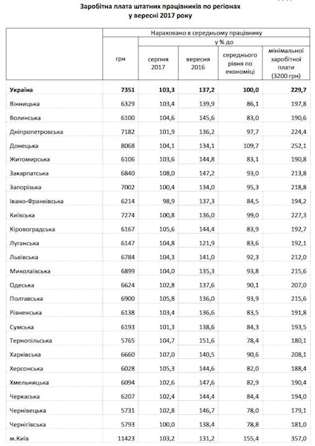В Украине в сентябре 2017 года средняя зарплата побила рекорд предыдущего месяца и составила 7351 грн.