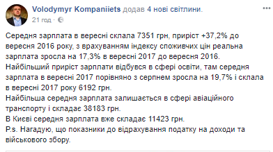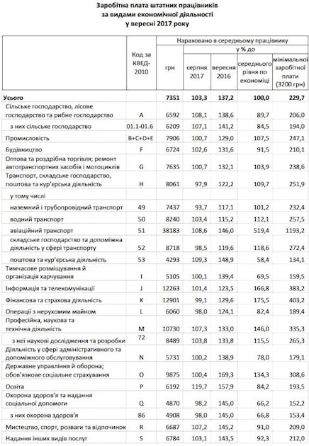 "Наибольший прирост зарплаты состоялся в сфере образования, там средняя зарплата в сентябре 2017 по сравнению с августом выросла на 19,7% и составила в сентябре 2017 6192 грн. Наибольшая средняя зарплата остается в сфере авиационного транспорта и составляет 38183 грн. В Киеве средняя зарплата уже составляет 11423 грн", - рассказал он.