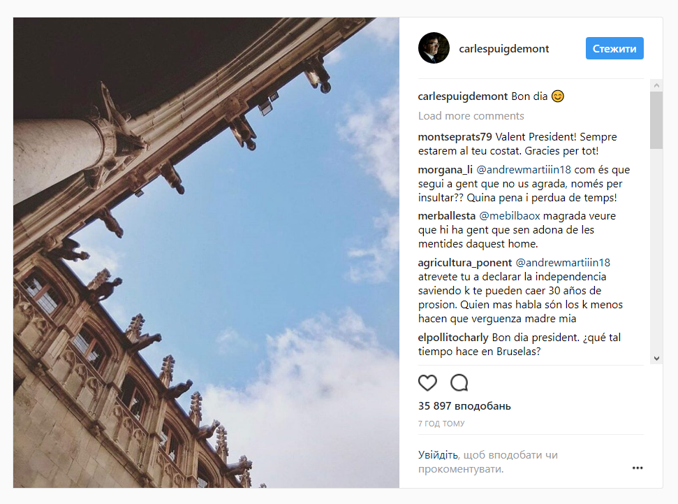 При этом еще утром в понедельник Пучдемон опубликовал в своем Instagram фотографию, из которой следовало, что он находится в здании правительства Каталонии в Барселоне.