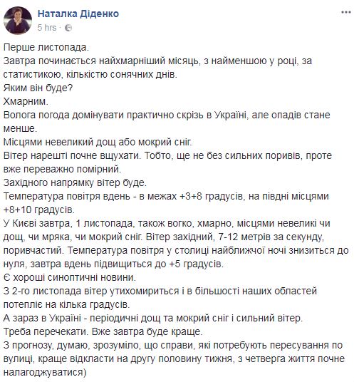 "Завтра начинается самый облачный месяц, с наименьшим в году, по статистике, количеством солнечных дней. Каким он будет? Облачным. Влажная погода будет доминировать практически везде в Украине, но осадков станет меньше. Местами небольшой дождь или мокрый снег. Ветер наконец начнет утихать", - пишет Диденко.