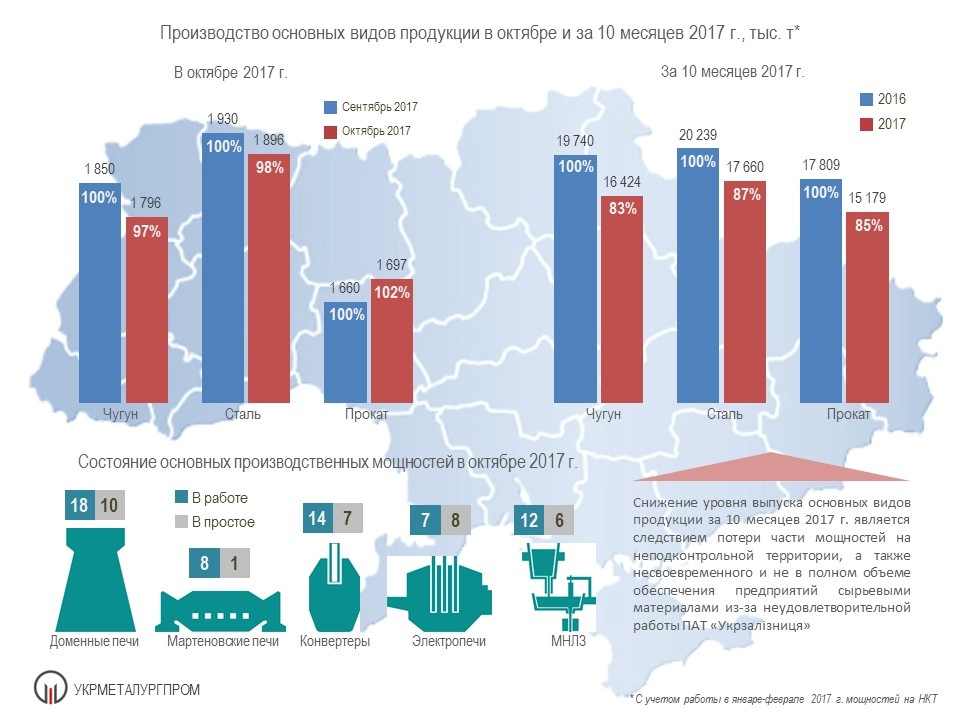 Кроме того, в январе-октябре 2017 года предприятиями горно-металлургического комплекса Украины (с учетом деятельности в январе-феврале 2017 года мощностей, находящихся на НКТ) произведено: чугуна 16,4 млн т (83% от аналогичного периода 2016 года), проката 15,2 млн т (85% от 2016 года).