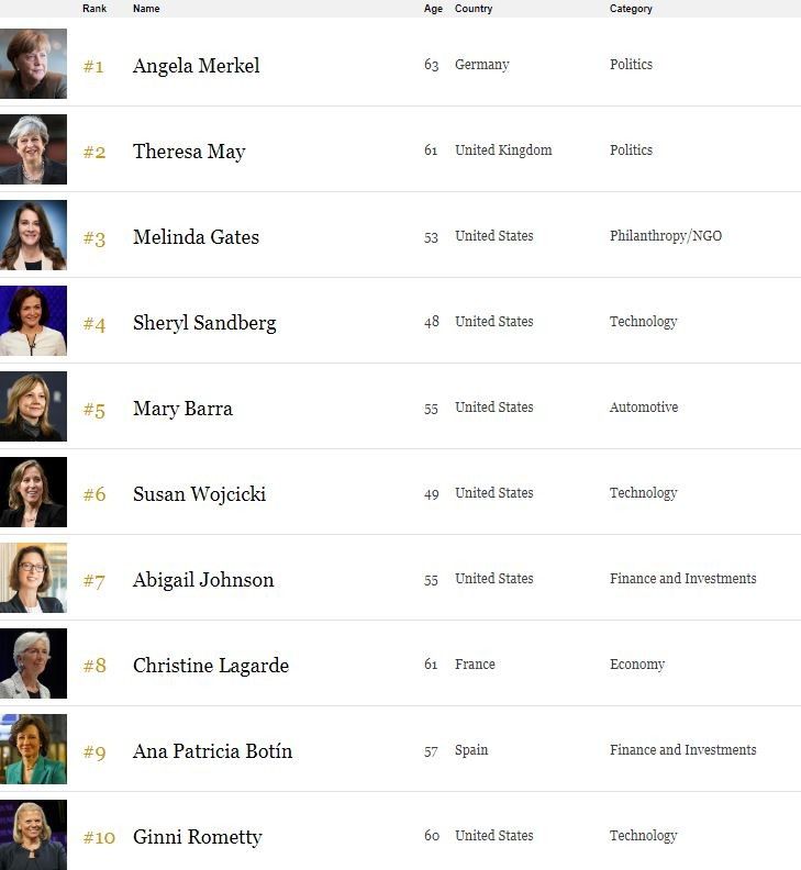 Кроме того, в первую пятерку также вошли Мелинда Гейтс (супруга миллиардера Била Гейтса) – 3-е место; 4 – главный исполнительный директор Facebook Шерил Сандберг; 5 – гендиректор General Motors Мэри Барра.