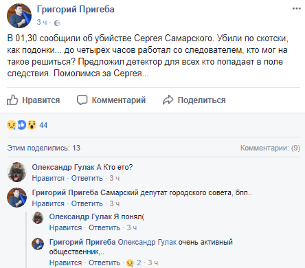 "В 01:30 сообщили об убийстве Сергея Самарского. Убили по скотски, как подонки... до четырёх часов работал со следователем, кто мог на такое решиться? Предложил детектор для всех кто попадает в поле следствия. Помолимся за Сергея...", - написал Пригеба.