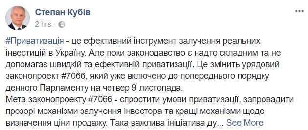 "Приватизация – это эффективный инструмент привлечения реальных инвестиций в Украину. Но пока законодательство слишком сложное и не помогает быстрой и эффективной приватизации. Это изменит правительственный законопроект №7066, который уже включен в предварительную повестку дня парламента на четверг, 9 ноября", – рассказал глава МЭРТ.