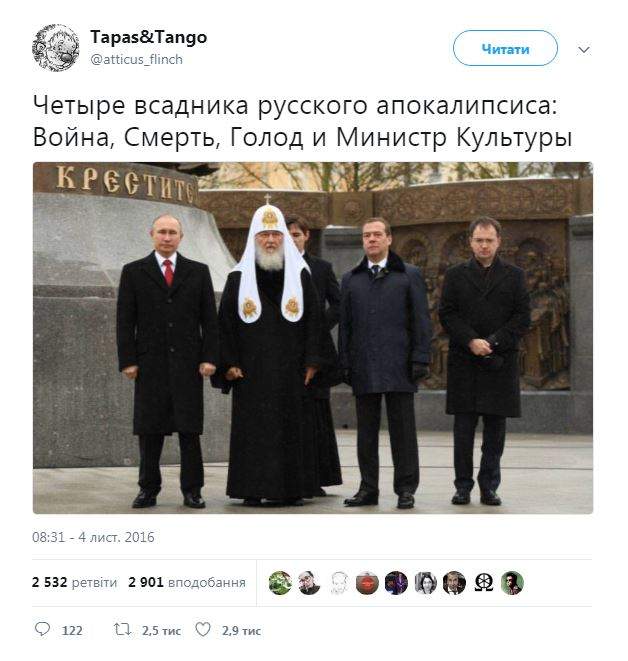 "Четыре всадника русского апокалипсиса: Война, Смерть, Голод и Министр Культуры", - написали в сети.