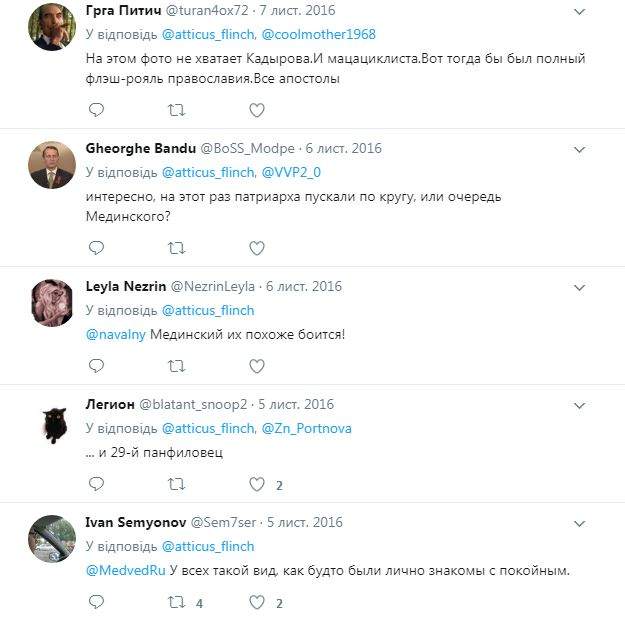 "На этом фото не хватает Кадырова. И моцоциклиста. Вот тогда бы был полный флэш-рояль православия. Все апостолы".