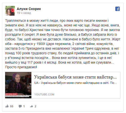 "Насыщенная у бабушки была жизнь. Шутка разве - родиться в 1900! Царя пережила, 2 мировые войны, коммунистов, застала 5-го президента уже независимой Украины! Трижды замужем, у нее более 100 лет трудового стажа, потому что людей принимала до последних дней, и в тюрьме успела посидеть", - написала журналистка.
