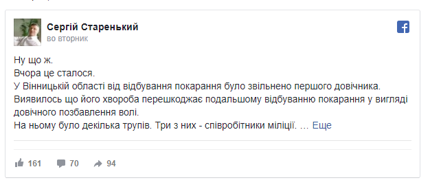 "Оказалось, что его болезнь препятствует дальнейшему отбыванию наказания в виде пожизненного лишения свободы. На нем было несколько трупов. Три из них - сотрудники милиции", - написал он.