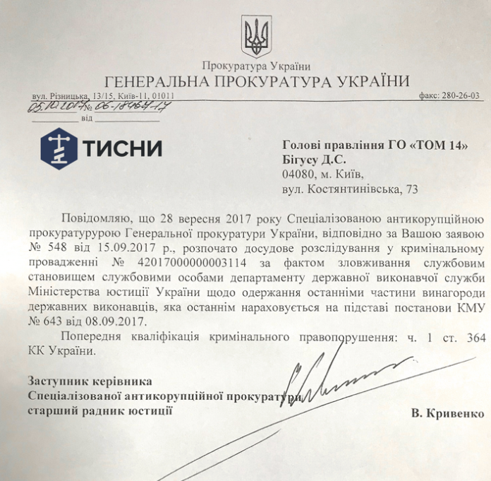 «По факту злоупотребления служебным положением должностными лицами департамента государственной исполнительной службы Министерства юстиции Украины относительно получения последним части вознаграждения государственных исполнителей», — отмечается в письме Генпрокуратуры.