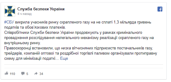 Так, СБУ установила, что ряд украинских предприятий поставщиков газа, трейдеров, компаний оптовой и розничной торговли топливом организовали противоправную схему для минимизации налогов и обязательных платежей.
