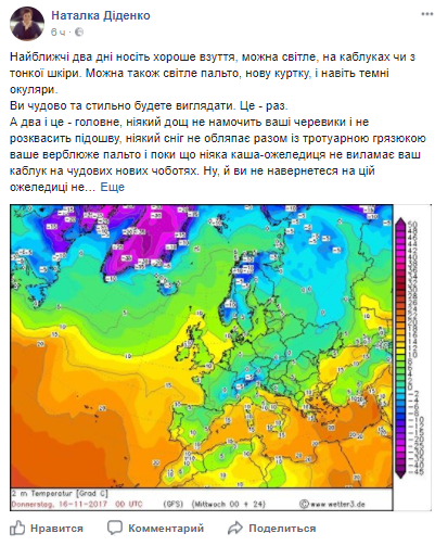 "Ближайшие два дня носите хорошую обувь, можно светлую, на каблуках. Можно светлое пальто, новую куртку, и даже темные очки. Вы прекрасно и стильно будете выглядеть. Это - раз. А два, и это - главное, никакой дождь не намочит ваши ботинки и не расквасит подошву. Одним словом, завтра нас ждет такой день, который осенью бывает редко", - пишет синоптик.