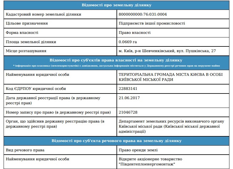 В конце июля фирма также купила отдельно стоящий гараж в усадьбе жилого дома площадью 15,7 кв. м на ул. Пушкинской 27. А вскоре в Киевском горсовете подготовили проект решения о передаче ООО "Региональные ресурсы" земельного участка в аренду на 15 лет площадью 0,09 га для эксплуатации и обслуживания нежилого здания и гаража на ул. Пушкинской, 25-б в Шевченковском районе Киева.