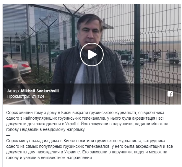 "Сорок минут назад из дома в Киеве похитили грузинского журналиста, сотрудника одного из самых популярных грузинских телеканалов, у него была аккредитация и все документы для нахождения в Украине. Его заковали в наручники, надели мешок на голову и увезли в неизвестном направлении", - рассказал Саакашвили.