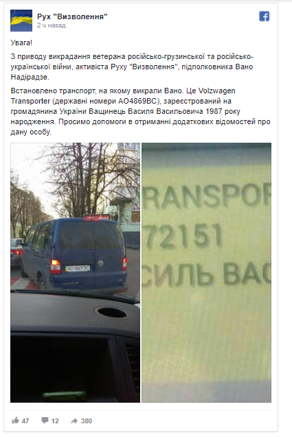 В свою очередь в Движении Вызволення заявили, что грузинский ветеран АТО является их активистом, и опубликовали снимок микроавтобуса, на котором его увезли.