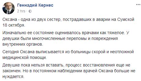 Сегодня, 21 ноября, врачи выписали из Харьковской городской клинической больницы Оксану Евтееву - одну из двух сестер, пострадавших 18 октября в ужасном ДТП в Харькове, повлекшем гибель 6 и госпитализацию 5 пешеходов.