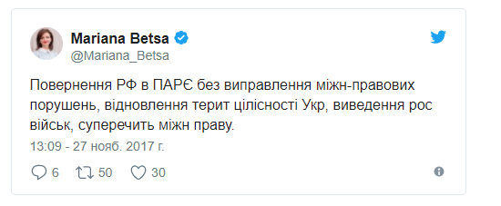 "Возвращение РФ в ПАСЕ без исправления международно-правовых нарушений, восстановления территориальной целостности Украины, вывода российских войск, противоречит международному праву", - написала Беца.