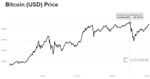 Сегодня утром, 27 ноября, курс биткоина поднимался до 9 731 долл. – нового исторического максимума. По состоянию на 14:35 стоимость самой популярной криптовалюты откатилась до 9 699 долл.
