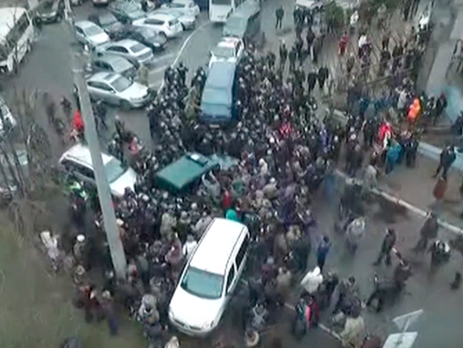 Микроавтобусу не дают выехать, несколько десятков человек образовали живой щит вокруг авто с Саакашвили. Машина медленно передвигается по несколько метров в минуту. Активисты уже разбили лобовое стекло.