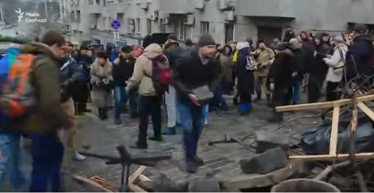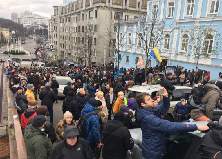 На улице Трехсвятительской в Киеве, где стоит заблокированный автомобиль с задержанным Михаилом Саакашвили, его сторонники начали строить баррикады из мусорных баков, веток, досок и других подручных материалов.