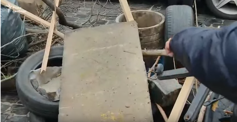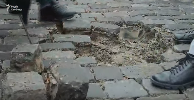Также собравшиеся активно разбирают брусчатку. Для этого они используют железные прутья.