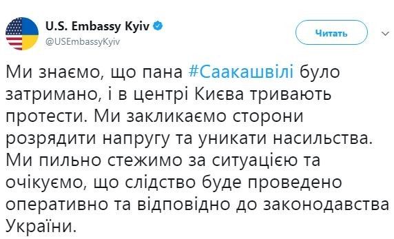 "Мы знаем, что господин Саакашвили был задержан, и в центре Киева продолжаются протесты. Мы призываем стороны разрядить напряжение и избегать насилия. Мы пристально следим за ситуацией и ожидаем, что следствие будет проведено оперативно и в соответствии с законодательством Украины", – говорится в заявлении посольства США.