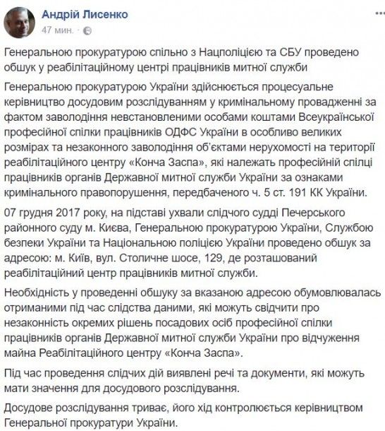 Генеральная прокуратура провела следственные действия в рамках досудебного расследования в уголовном производстве по факту завладения неустановленными лицами средствами Всеукраинского профессионального союза работников ГФС в особо крупных размерах, а также незаконного завладения объектами недвижимости на территории реабилитационного центра "Конча Заспа", которые принадлежат профсоюзу ГФС. В данных действиях усматривают признаки уголовного преступления, предусмотренного ч. 5 ст. 191 УК Украины.
