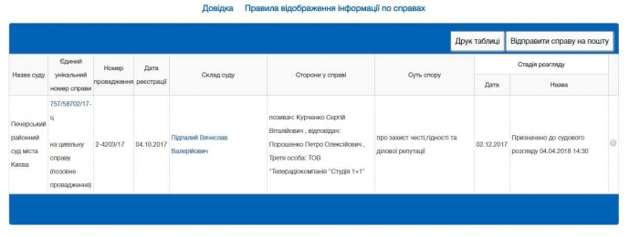 Согласно данным в Едином государственном реестре судебных решений, Курченко подал иск о защите чести, достоинства и деловой репутации против Порошенко и телерадиокомпании «Студия 1+1» еще 4 октября.