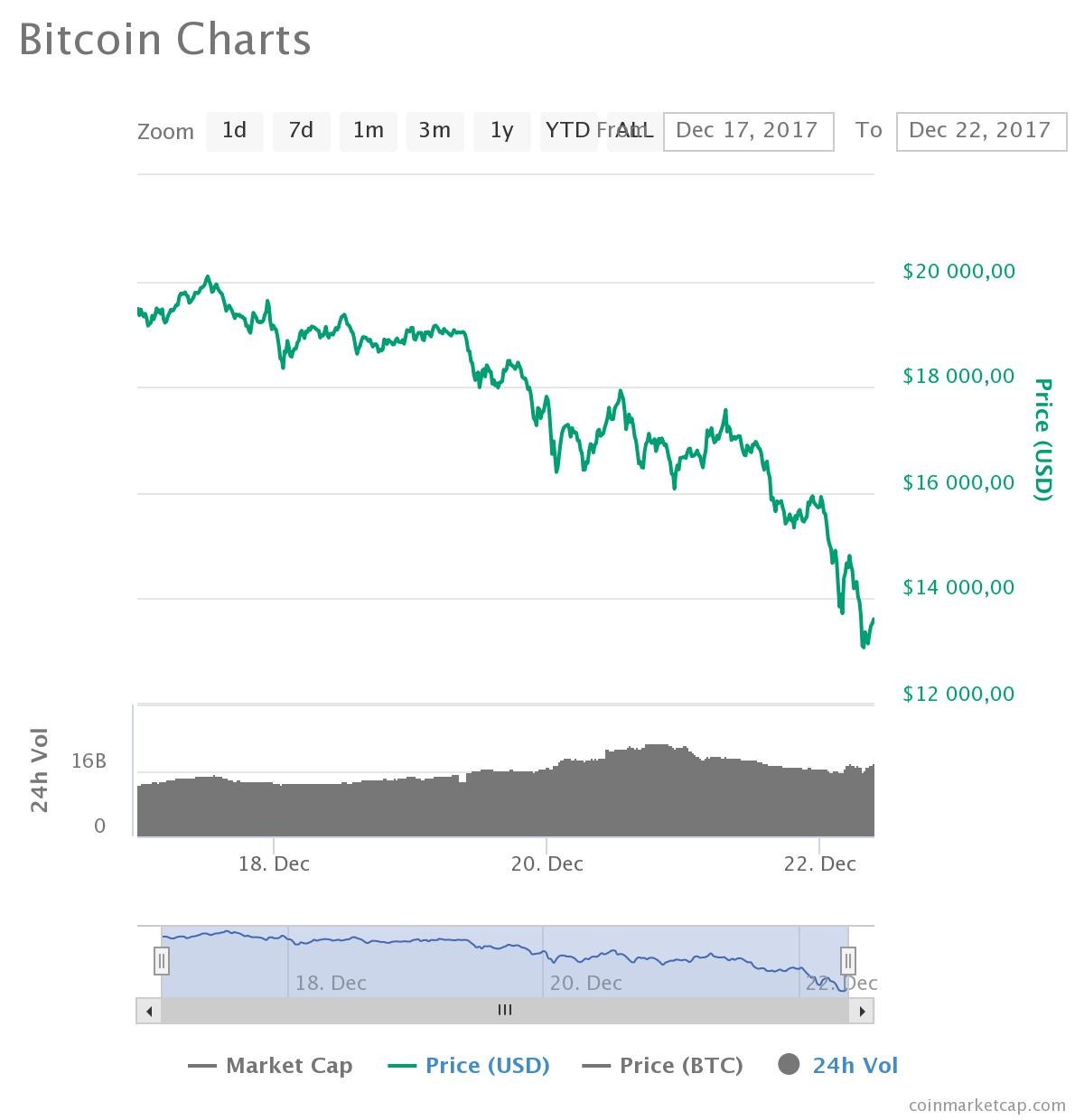 Так, 22 декабря средневзвешенный курс криптовалюты опускался до $12 874 за монету. Еще 17 декабря биткоин поднимался выше $20 тыс. То есть, меньше чем за неделю цена криптовалюты обвалилась почти на 36%.