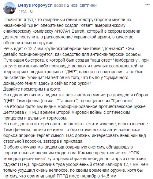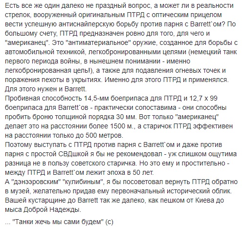 "В обоих случаях мы видим однозарядную систему, обладающую поразительным внешним сходством. Как мне представляется, "ОПК молодой республики" кустарным образом переделал старый советский гаджет ПТРД, присобачив туда укороченный ствол калибра 12,7 мм, чем только ухудшил очень неплохое, по своим временам оружие, хотя бы потому, что оригинальный ПТРД имеет калибр в 14,5 мм", - написал он.