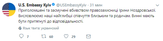 Посольство США в Украине шокировано гибелью украинской правозащитницы, юриста Ирины Ноздровской и призывает наказать виновных. Об этом говорится в сообщении ведомства в Twitter.