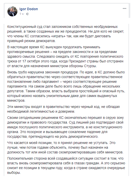 "Конституционный суд стал заложником собственных необдуманных решений, а также созданных им же прецедентов. Ни для кого не секрет, что члены КС согласились "играть" так, как им будет диктовать правящий режим демократов... Конституционный суд вынужден продолжать принимать противоречивые решения – на пределе законности и за пределами здравого смысла", - написал Додон.